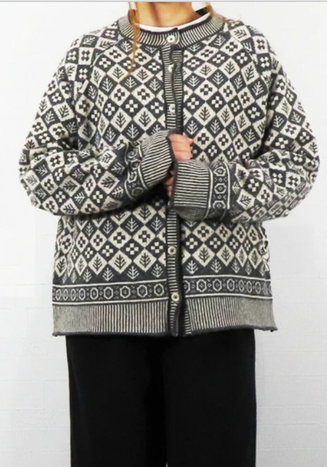 2025秋冬新作 ウール100%総柄ジャガード クルーネックカーディガン