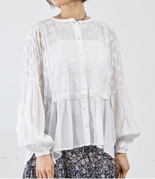 草花をモチーフにした刺繍デザインが印象的なブラウス