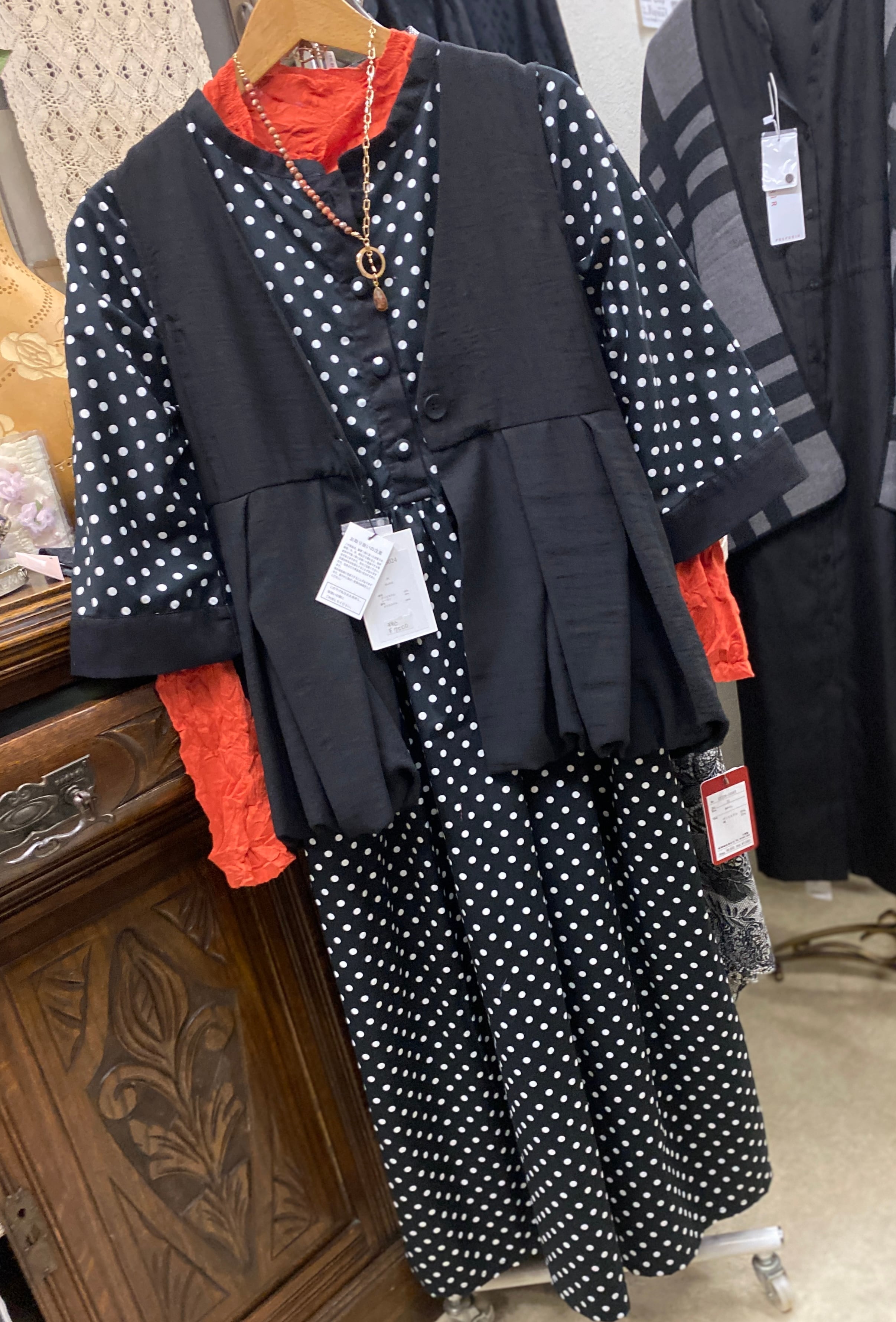 Rapunzelオリジナル 黒地にホワイトの水玉模様のコットン生地を使ったワンピース 七分袖 両脇ポケット付き