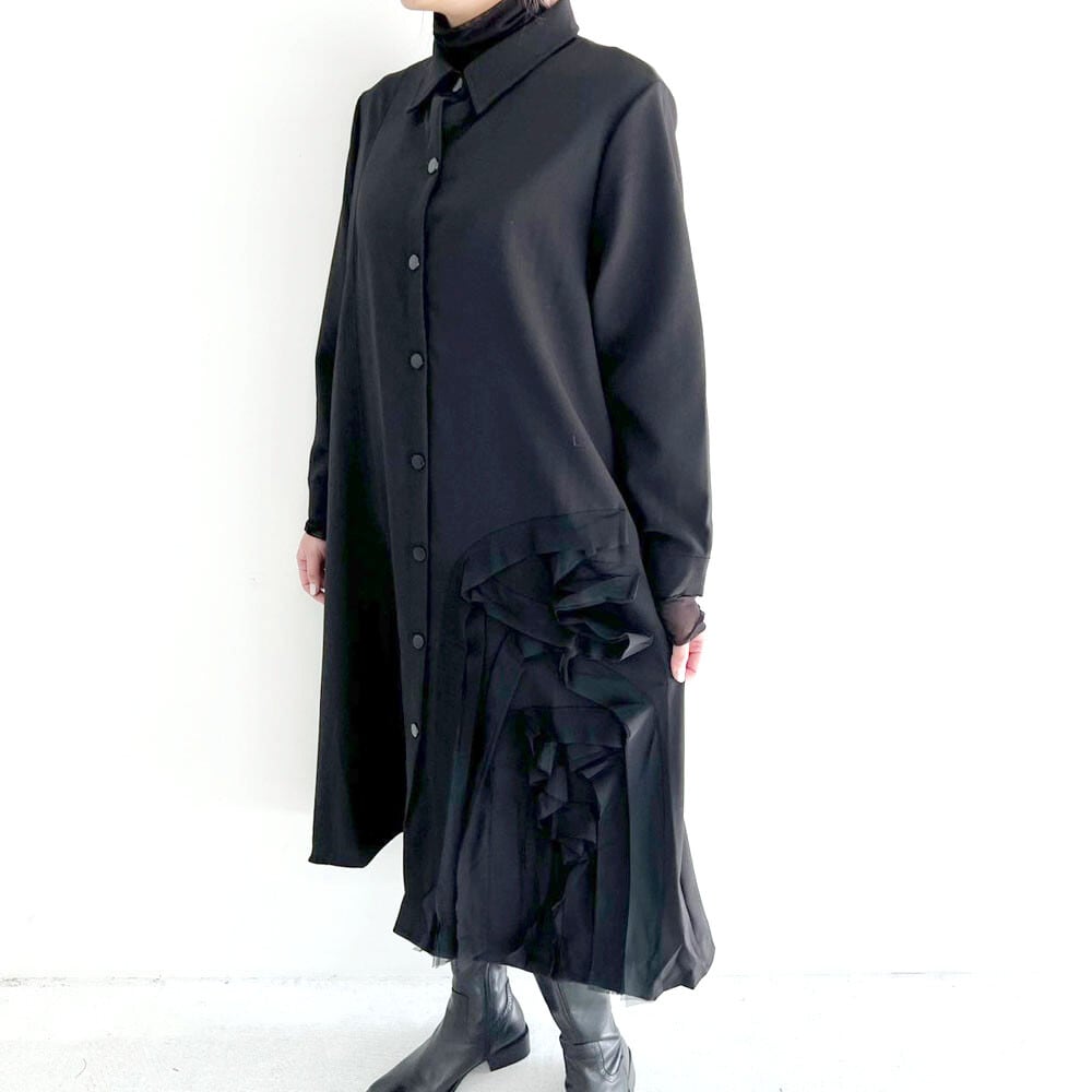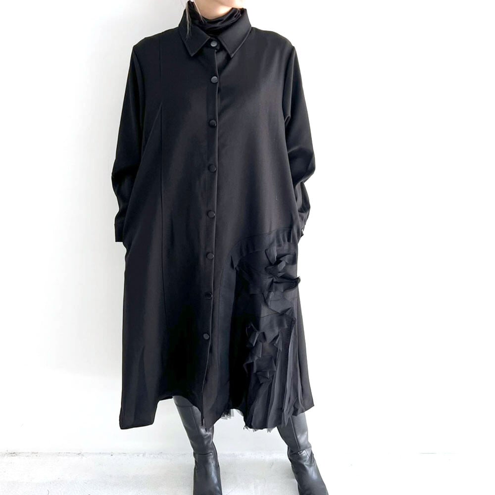 裾のアートモチーフがシックな印象のロングシャツワンピースゆったりサイズで体系カバー